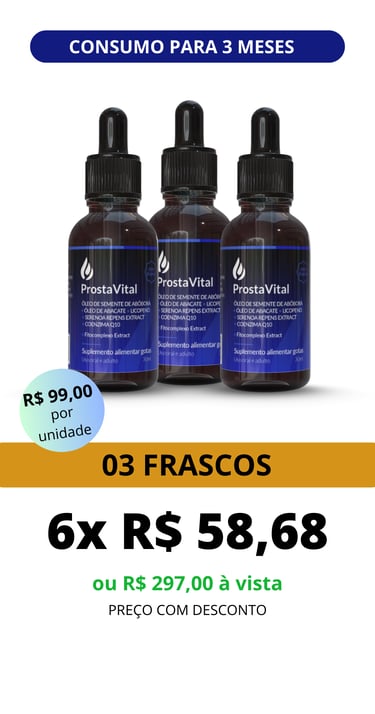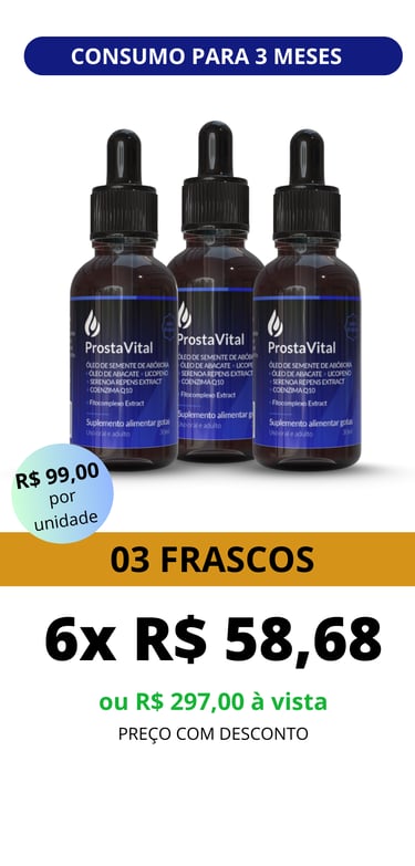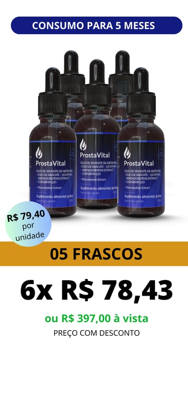 Desenvolvido a partir de uma combinação de vitaminas, minerais e extratos de plantas cuidadosamente selecionadas para aliviar os sintomas da próstata inchada (ou prostatite). Seu consumo é seguro, sem efeitos colaterais e indicado para uso contínuo. Cada frasco de Prostavital possui 30 ml e oferece uma fórmula potente e eficiente para auxiliar no cuidado com a próstata e no aumento do bem-estar.